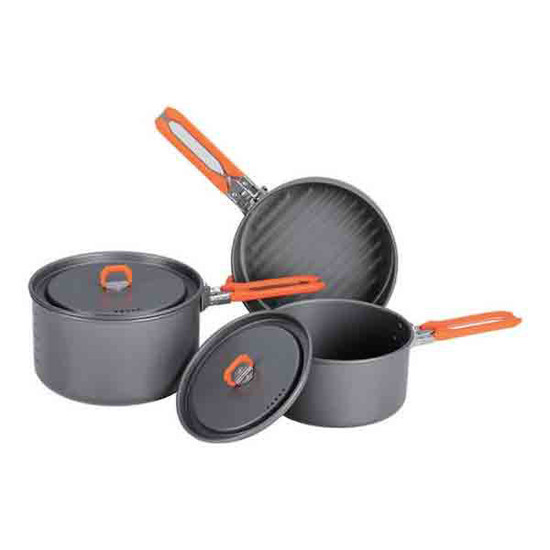 ست لوازم پخت و پز کوهنوردی فایرمپل مدل FEAST 3 شامل ماهی تابه، دو قابلمه درب دار در دو سایز مختلف ، کفگیر ، دو عدد کاسه کوچک و اسکاچ میباشد. این ست ظروف به راحتی قابل حمل می باشند و پک کامل آن داخل کیف توری قرار میگیرد. این ست در داخل هم جا گذاری می شوند تا فضای بسیار کمی را اشغال نمایند و به راحتی در کوله پشتی شما جای گیرند. جنس آلومینیوم سخت با روکش نچسب در این مدل به شما امکان میدهد تا علاوه بر اینکه بابت سنگینی ظروف غذای خود مشکلی نداشته باشید، ظرفهایتان از دوام بسیار بیشتری برخوردار باشند و در کنار آن، بابت چسبیدن غذا به ته قابلمه یا ماهیتابه ی خود هم نگران نباشید. کتری این مجموعه دارای دستهی فلزی با روکش پلاستیکی است که امکان جابهجایی راحتتری را برای شما فراهم کرده است؛ همچنین دستهی قابلمه و ماهیتابهی ظرف غذای فایرمپل مدل Feast 3 فلزی با قسمت مخصوص نگهداری دست، از جنس پلاستیک نسوز است و تاشو و قفل دار می باشند.